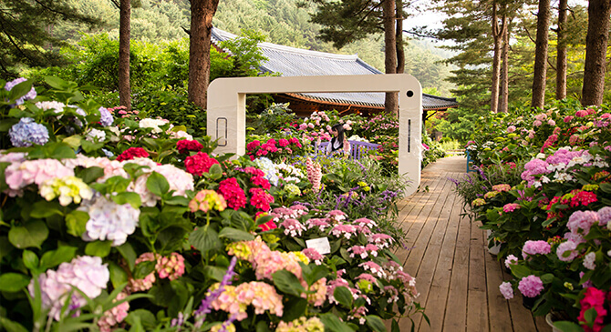 이번 전시회에서는 아침고요 수목원의 독특한 정원미학, '곡선과 여백의 미'를 선보입니다. 전시장 안에서 새로운 포토존을 구성하여, 아름다운 수국과 함께 촬영하고, 그 순간을 추억으로 남길 수 있는 자연의 아름다움을 느껴 보세요.