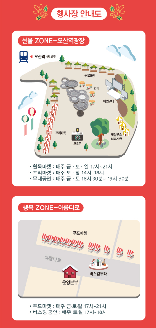 제1회 오산 크리스마스 마켓은 단순한 축제가 아닌, 지역 상권을 살리고, 지역민과 방문객이 함께 어울릴 수 있는 축제의 장입니다. 오산역 광장과 아름다로에서 펼쳐지는 이 축제는 겨울밤을 환하게 밝히며 모두에게 특별한 추억을 선사할 것입니다. 올 겨울, 오산에서 만나는 화려한 축제의 세계로 여러분을 초대합니다.